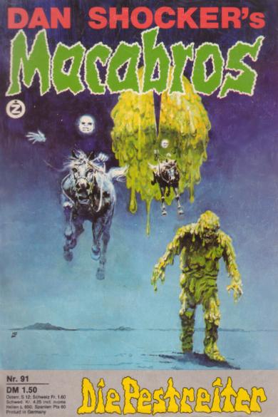 Meinung: Wiederum betritt Myriadus, der Tausendfältige den Macabros-Kosmos. Diesmal schickt er der Erde die Pestreiter, um die Bevölkerung mit einem unheilbaren Pestbazillus zu vernichten. Diese Pestreiter sind interessante Figuren, sitzen sie doch auf schwarzen Pferden, aber von ihnen selbst ist nur der fahle, runde Kopf sowie die weißen Hände zu sehen, der Körper ist unsichtbar. Wie das physikalisch vor sich gehen soll, entzieht sich meiner Kenntnis, aber in Gruselromanen darf man einfach nicht absolute Logik voraussetzen. Jedenfalls sind sie Geistwesen, die durch die Körper der Menschen reiten und sie so infizieren. Diese Idee ist wieder einmal typisch Dan Shocker, der ja kaum auf die klassischen Grusel- und Horrorelemente zurückgriff.
