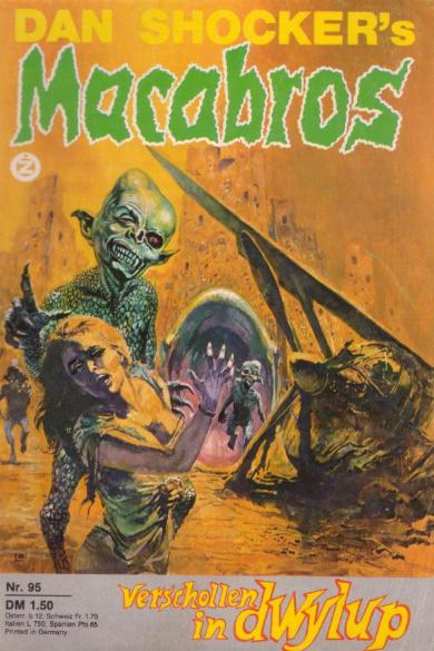 Das Titelbild entspricht der Szene im Roman, als Claire Monescue in die Hände der Dwylup-Monster fällt und es vermeidet, sie anzusehen. Das Monster im Vordergrund ist schön schaurig dargestellt, wenn ich auch nicht ganz verstehe, warum ich mich beim Betrachten nicht in Staub auflöse ... Im Hintergrund ist die Stadt silhouettenhaft angedeutet, ebenso die Köpfe im Mauerwerk. Gut gemalt erscheint mir auch der Fischmauleingang. An der Frau im Vordergrund und an dem Flugzeugwrack erkennt man die in Dwylup herrschende flirrende Hitze (dadurch wohl etwas unscharf aussehend).