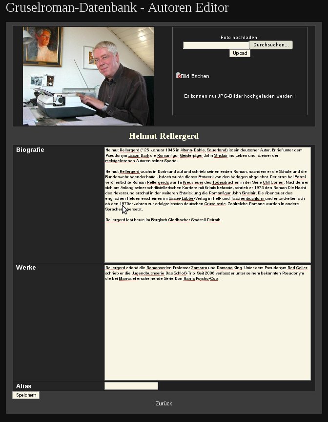 Ansonsten kann man ein paar Zeilen Text zur Biografie und den Werken des Autors schreiben. Wenn der Autor mit verschiedenen Pseudos in der Datenbank vertreten ist, kann man das Feld "Alias" benutzen. Es gibt z.B. einen zweiten Datensatz eines Herrn Jason Dark.