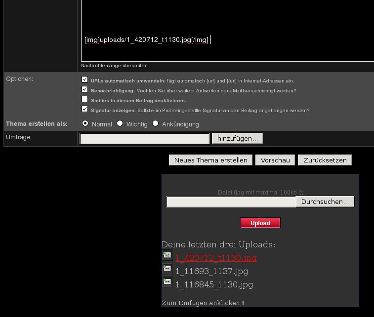 Ich habe mich mal an eine etwas umfangreichere Arbeit gemacht. Eine Beta-Version einer neuen Upload-Schnittstelle ist fertig. Damit kann man demnächst bequem jpg-Dateien bis 100kb hochladen und per Mausklick in den Beitrag einfügen. Das Popup, hangeln durch weitere Seiten und Kopieren des Url von Hand entfällt dann. Es wird merkbar bequemer.