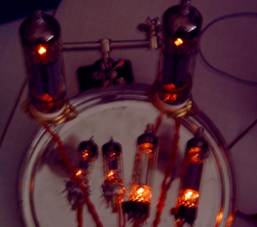 Immerhin leuchten die Heizungen von sechs der geplanten acht Röhren schon mal. Ein alter Trafo und diverse stromfeste Teile von einer 30 Jahre alten Drucker-Platine halfen dabei. Vier der Röhren stammen aus alten Fernsehern und sind über 40 Jahre alt. Die älteste Röhre bringt es auf über 60 Jahre.