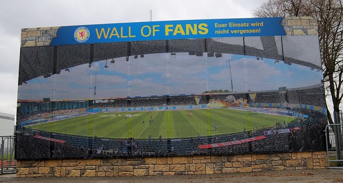 Als sichtbaren Ausdruck des Danks an Euch, haben Geschäftsführer Wolfram Benz und der Leiter der Fanbetreuung, Erik Lieberknecht, gemeinsam mit Mario Goldmann und Karsten König vom Vorstand der Fanabteilung, vor dem gestrigen Heimspiel gegenüber dem Eingang zu Block 10 die „Wall of Fans“ feierlich enthüllt, auf der sich alle Verzichter auf Wunsch verewigen lassen konnten. Aufnahmen davon wurden vor dem Anpfiff auf Videoleinwand gezeigt und alle Stadionbesucher konnten sich die fertige "Wall of Fans" im Rahmen des Heimspiels anschauen.