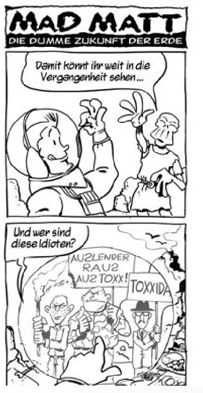 Nicht nur räumliche Sprünge kann die Folienaufzeichnung machen, auch Zeitsprünge sind möglich. Die beiden Gestrandeten erleben mit, wie die ersten anderen Rassen in Toxx landen. Damals noch ohne Vergessensstrahlung und automatischem Sprachübersetzer. Als die Konflikte immer größer werden, werden diese Technologien aktiviert. Straftäter werden von den Friedenswahrern geholt und als stumpfe friedliche Marionetten wiedergebracht. Und sie erfahren, wie die Folien entstehen, die sie gerade an den Helmen tragen.