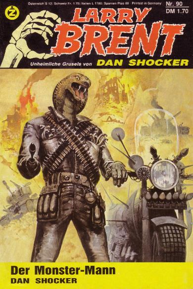 Ein Wächter aus Rha-Ta-N’mys schwarzer Garde kommt auf die Erde und das tut er natürlich in schwarzer Ledermontur und mit einem um Raketenwerfer und ähnlichen Firlefanz aufgemotzten Motorrad. Damit es etwas verfremdet wirkt, dichtet ihm Shocker einen riesigen Kobra-Schädel auf die Schultern. Zwischendurch gibt’s dann noch einiges Gedöns mit einer Rockerbande (und damit dann auch noch einen zweiten Motorrad-Heini). Nebenher tauchen merkwürdige Truhen auf, die als eine Art Dimensions-Transmitter fungieren. Und vor den Seiten des Heftes: der Leser, der ratlos darüber grübelt, was dieser Unsinn eigentlich soll. Da das ganze wirklich so langweilig ist, wie es sich hier liest, lässt der Autor dann diese wandelnde Monster-Mann-Armada noch massig Kleinholz auf seinem Weg veranstalten, sprich: es geht reichlich zu Bruch. Allerdings schafft der dämonische Dödel es nicht, mit seinem Waffenarsenal den Helikopter mit Brent an Bord in die Peripherie zu blasen, lediglich gestreift wird das Fluggerät und somit zur Landung gezwungen. Was für ein Stümper!