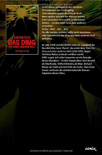 Zwölf Mann, gefangen in der Antarktis. Elf entdecken den Eindringling. Zehn kämpfen gegen die fremde Kraft. Neun quälen sich mit der Antwort herum. Acht versuchen verzweifelt zu überleben. Sieben... werden einer nach dem anderen vernichtet. Sechs... fünf... vier... drei. Sie alle werden sterben, sollte nicht irgendwer oder irgendetwas das Ding aus einer anderen Welt aufhalten. Im Jahr 1938 veröffentlichte John W. Campbell die Novelle WHO GOES THERE?, die unter dem Titel DAS DING AUS EINER ANDEREN WELT (USA 1951, Regie: Christian Nyby) erstmals verfilmt wurde. 1982 wagte sich John Carpenter an ein Remake dieses Klassikers – in den Hauptrollen: Kurt Russell als MacReady, Wilford Brimley als Blair, Richard Masur als Clark und Joel Polis als Fuchs. Alan Dean Foster verfasste die atemberaubende Roman-Adaption dieses Films.