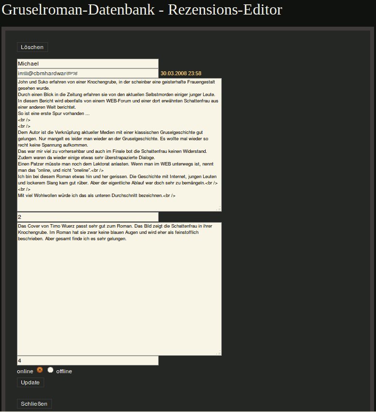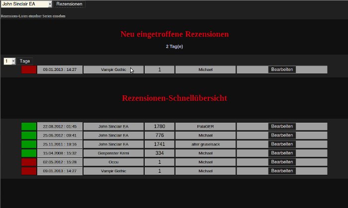 Dort können dann neue Rezensionen und eine kleine Auswahl (die letzten drei) aller Serien eingesehen werden. Über den Button "Bearbeiten" läßt sich ein Editor öffnen. Rot und Grün bedeuten: Grün: Online, können also vom Besucher gelesen werden und Rot dementsprechend das Gegenteil.