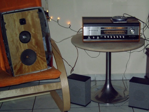 Pappkarton und Sperrholz-Box mit selbstgebauter 2-Wege-Weiche aus vorhandenen Teilen zum Testen. Die bringt so sagenhafte knapp 5 Watt Sinus, etwa 10 Watt Musik in der Spitze an 4Ohm. Sehr gemütlich und klingt richtig gut.