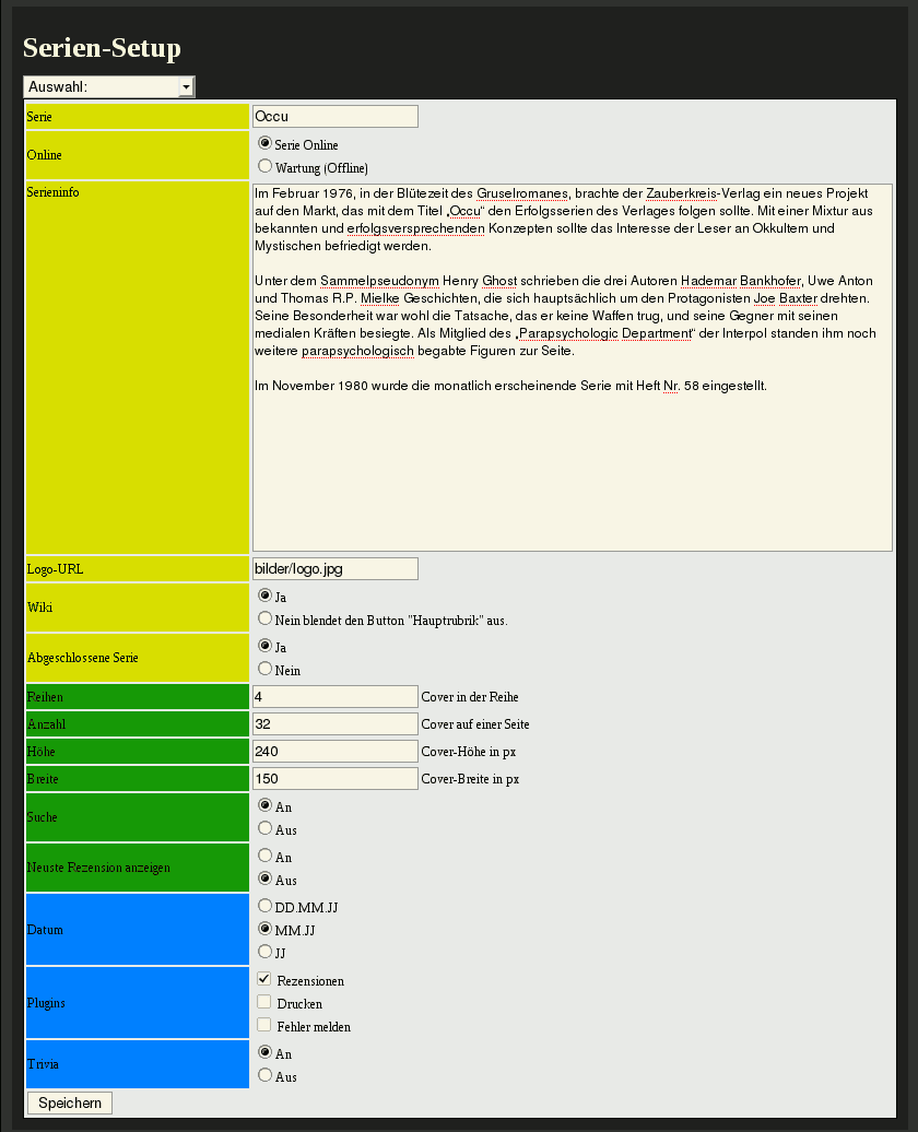 Ein internes Serien-Setup für die Serien kam nun auch hinzu. Das sind die aktuellen Einstellungen für die Serie Occu. Ein kleiner Fehler hat sich eingeschlichen: "Reihen müsste Spalten heißen."